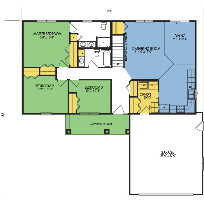 A part of our Dream Series, the Elderberry floor plan features 3 bedrooms and 2 bathrooms, a 2 car garage, a footprint of 54x52 feet and 1456 total square feet of living space. Floor Plan #DR144