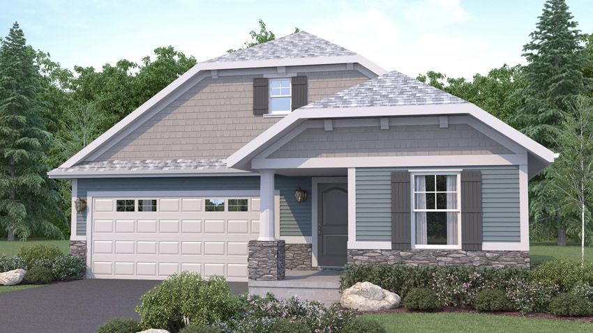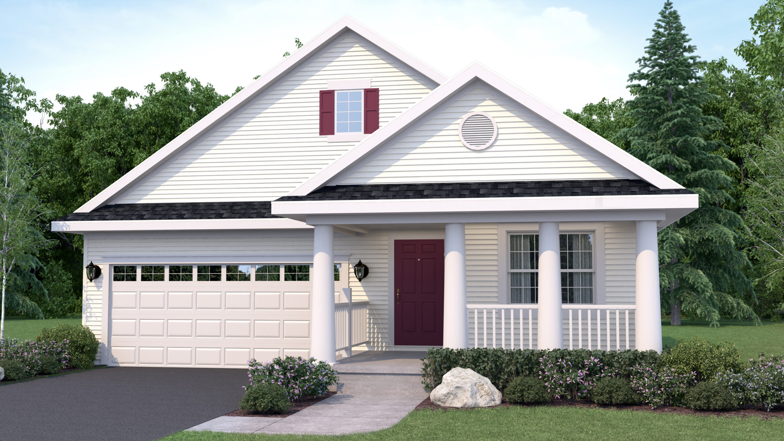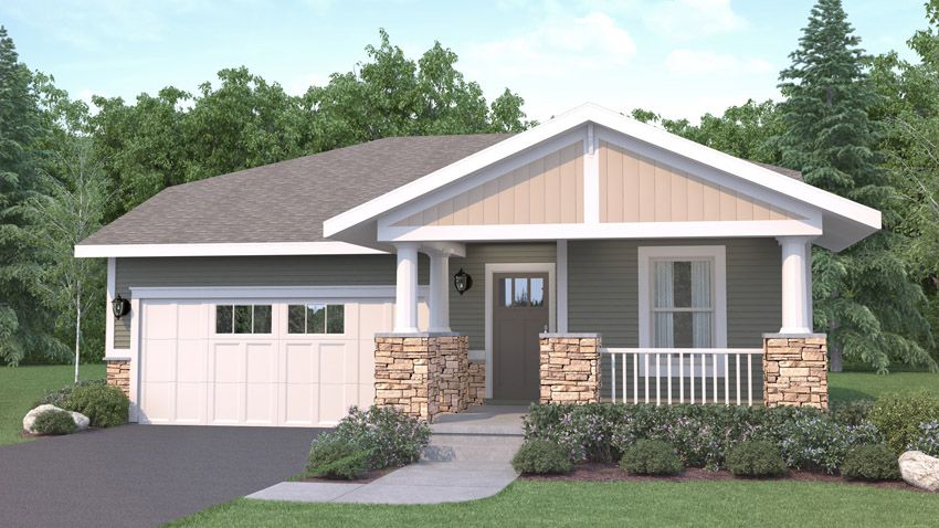 Exterior rendering of Sycamore 2 bed/2 bath floor plan. Country exterior style. Country
