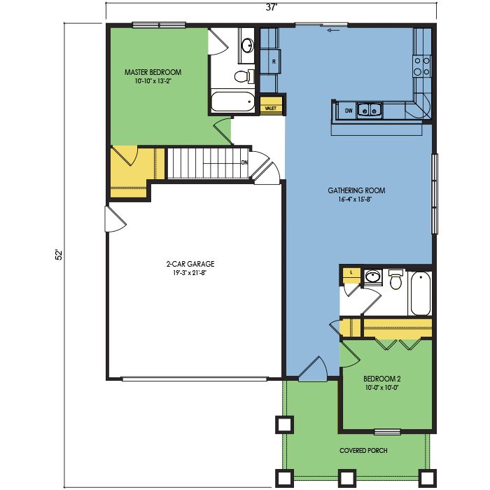 A part of our Dream Series, the Sycamore floor plan features 2 bedrooms, 2 bathrooms, a 2 car garage, a footprint of 37x46 feet, and 1123 total square feet of living space. Floor Plan #DR115