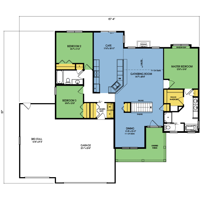 A part of our Family Series, the Voyageur floor plan features 3 bedrooms and 2 bathrooms, a 3 car garage, a footprint of 67x57 feet, and 1841 total square feet of living space. Floor Plan #FM104