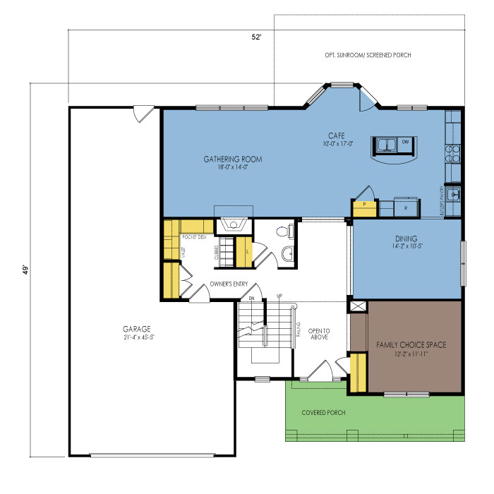 A part of our designer serie, the whispering lakes floor plan features 4 bedrooms and 2.5 bathrooms with a foot print of 52x49 feet and 2611 total square feet of living space. Floor Plan #DN218