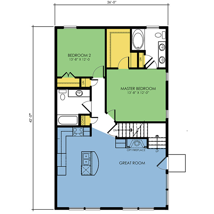 A part of our Vacation Series, the Winneconne floor plan features 4 bedrooms and 3 bathrooms with a foot print of 26x42 feet and 1721 total square feet of living space. Floor Plan #VL302