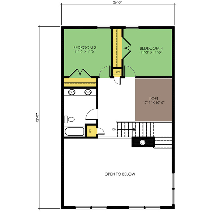 A part of our dream series, the tamarack floor plan features 3 bedrooms and 1.5 bathrooms with a foot print of 44x30 feet and 1342 total square feet of living space.
